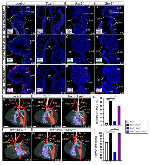 Gbx2 heterozygosity does not modify the Tbx1;Pax9 double heterozygous phenotype. (A–L) Tbx1, Pax9 and Gbx2 expression in E9.5–E10.5 control and Tbx1−/−, Pax9−/− and Gbx2−/− embryos (n ≥ 3 embryos per probe; 23–34 somites). (A) Tbx1 is expressed in the pharyngeal endoderm, mesoderm and ectoderm in control embryos. Tbx1 expression is absent in Tbx1−/− embryos (B), reduced in Pax9−/− embryos (C), and normal in Gbx2−/− embryos (D). (E) Pax9 is expressed in the pharyngeal endoderm in control embryos. Pax9 expression is reduced in Tbx1−/− embryos (F), absent in Pax9−/− embryos (G), and present in Gbx2−/− embryos (H). (I) Gbx2 is expressed in the pharyngeal endoderm in control embryos. Gbx2 expression is reduced in Tbx1−/− embryos (J), reduced in Pax9−/− embryos (K), and absent in Gbx2−/− embryos (L). (M–R) 3D reconstructions of E15.5–16.5 hearts from µCT datasets. (M) Control embryo with normal heart and aortic arch arteries. (N) Tbx1+/− embryo with aberrant right subclavian artery (A-RSA). (O) Tbx1+/−;Pax9+/− embryo with interrupted aortic arch type B (IAA-B) and cervical origin of the right subclavian artery (cRSA). (P) Tbx1+/−;Gbx2+/− embryo with a right-sided aortic arch (RAA) and A-RSA. (Q,R) Tbx1+/−;Pax9+/−+/−;Gbx2+/− embryos with IAA-B and A-RSA. (S,T) Graphical representation of IAA-B incidence (S) and 4th pharyngeal arch artery (PAA) incidence (T) in Tbx1;Pax9;Gbx2 embryos. * p < 0.05; ** p < 0.001; *** p < 0.0001; Pearson chi-squared test for associations with continuity correction. Scale bars: 500 μm in M-R; 50 μm in (A–L). Abbreviations: Ao, aorta; AD, arterial duct; LCC, left common carotid artery; LSA, left subclavian artery; LV, left ventricle; me, mesoderm; pa, pharyngeal arch; pe, pharyngeal endoderm; p.ect, pharyngeal ectoderm; RCC, right common carotid artery; RSA, right subclavian artery; RV, right ventricle; s, somite. The somite numbers given in the legend reflect the range analysed for the whole study. The figure contains representative images only.
