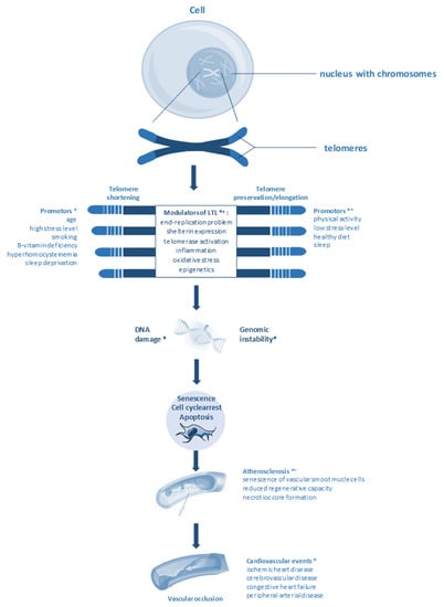 Telomeres occur in all nucleated cells. At birth, every person has a specific telomere length (TL) that ranges between 5 to 15 kb [3,9]. Throughout life, telomeres shorten continuously with a rate between 20–50 bp due to factors, such as the end-replication phenomenon, oxidative stress, and others. The end replication problem refers to the inability of DNA polymerase to fully replicate the 3′ end of chromosomes, which leads to the loss of a small telomeric DNA fragment with every cell division [10]. When telomeres become critically short, they lose their protective properties and send cells into senescence, or cause cell death [10]. Telomere shortening rates, and consequently, average TL vary amongst different tissue types, which is at least partly explained by tissue-specific proliferation rates [9]. In dividing cells, the end replication problem is the principal driver of telomere shortening that can be modified by other factors, such as oxidative stress or inflammation [4,11]. In post-mitotic cells, instead, oxidative stress can directly damage telomeric DNA and drive cells into senescence. Despite tissue-specific proliferation rates, TL in different tissues and peripheral blood leucocytes are correlated [9,12,13]. Therefore, leucocyte telomere length (LTL) has been proposed as a surrogate marker of TL in the entire body [9,12,13]. Considering that most studies in the area of vascular disease analyzed telomeres in peripheral blood leucocytes, this review focuses primarily on LTL and mentions TL in other cell types only when necessary.