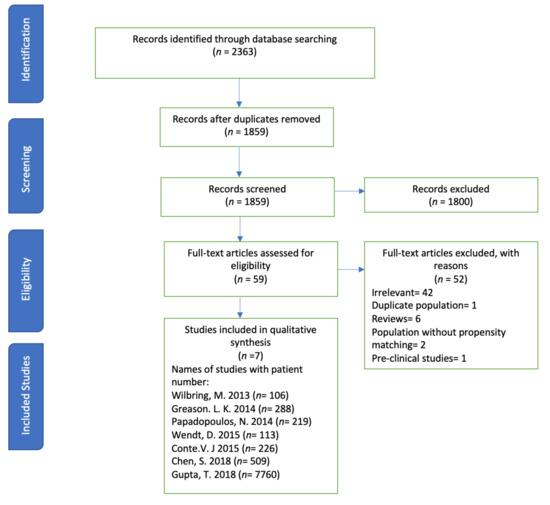 Only seven studies qualified this strict selection criteria (number of patients (n) = 8221): all studies were retrospective. The reasons for exclusion for the other 52 articles were: duplicates (1), preclinical studies (1), irrelevance (42), reviews (6), and population without propensity matching (2). The exclusion criteria were preclinical studies, studies showing no subjective data regarding the safety or efficacy of SAVR/TAVR in patients with AS, studies including patients undergoing redo-SAVR or redo-AV replacement, and interim reports of studies other than the most recent one. The two studies were excluded although these studies included study population, but these observational studies reported outcomes without propensity matching of TAVR in AS. The included outcomes were 30-day all-cause mortality, 1–2-year all-cause mortality, procedural time, acute kidney injury (AKI), bleeding complications, stroke, and duration of hospital stay between TAVR and SAVR groups. The main summary estimate was random effects odds ratio (OR) with 95% confidence intervals (CIs). The seven studies satisfied the initial inclusion criteria.