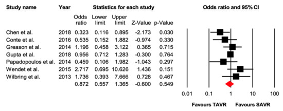 Seven studies reported 361 cases of 30-day all-cause mortality in patients undergoing TAVR versus SAVR in previous cardiac surgery patients. There were 125 events out of 4055 (3.0%) that occurred in the TAVR group and 136 events out of 4166 (3.26%) that occurred in the SAVR group. There was no significant difference between the two groups (OR 0.87 [95% CI: 0.56–1.37], p = 0.54).