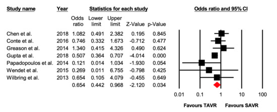 Seven studies reported data on stroke after the procedure. There were 89/4055 (2.19%) patients who suffered a post-operative stroke in the TAVR group, while 149/4166 (3.57%) patients had a stroke in the SAVR group. TAVR was associated with lower incidence of stroke (OR = 0.65 [95% CI: 0.44–0.97], p = 0.03), compared with SAVR in patients with previous cardiac surgery (Figure 4).