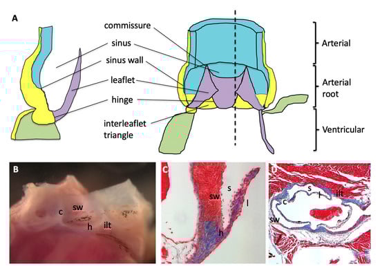 The aortic and pulmonary valves, which sit within the arterial roots between the myocardium of the left and right ventricular outflow tracts and the aorta and pulmonary trunk, respectively, are structurally similar to one another, and are closely comparable in humans and mice [,,]. Thus, in the mature heart both the aortic and pulmonary valves have three superficially similar leaflets that form the moving parts of the valve. The right (R) and left (L) sinuses of the aortic valve each host the ostium of a coronary artery, whilst the third non coronary/non-facing/posterior (N) and the three pulmonary valve sinuses are almost never associated with a coronary artery—even in congenitally malformed hearts. However, we now recognise the valve complexes to include more than just the three moving leaflets, with additional components including: the hinges, the attachment points of the leaflets to the wall; the commissures, the points of apposition of the leaflets close to the wall; the sinuses, pockets that form between the leaflets and the wall; and the interleaflet triangles, the regions of the wall that lie upstream (on the ventricular side) of the hinges, but are distal to the base of the sinuses that are found on the arterial side (Figure 1). The nomenclature used to describe the arterial roots is controversial. For example, the outflow tract has been divided by some authors into a proximal conus and a distal truncus, although this terminology is falling out of practice and three rather than two components are increasingly recognised. In this nomenclature, the distal component represents the intra-pericardial arterial trunks and the proximal component comprises the ventricular outflow tracts, with the valve complex appearing in the intermediate part []. In other contexts, anatomically artificial “rings” are described for clinically important measurements, although some publications have highlighted the misuse of these descriptions for developmental and anatomical purposes [,]. Thus, the development of this highly complex area remains the topic of speculation and controversy. One longstanding conundrum is, what are the similarities and differences between arterial and atrioventricular valve development, particularly those that relate to their pathology? How does the valve achieve an undulating crown-like attachment, crossing the arterial–myocardial boundary? How do the outflow cushions remodel to form the sculpted valve leaflets? Overall, the question of how aortic valve malformations relate to other cardiovascular malformations, both congenital and apparently acquired, has not been answered. The answer to all these puzzles may lie with the progenitor cells that form the arterial roots. Thus, a re-evaluation of arterial valve development focusing on the second heart field (SHF) and neural crest cells (NCC) may explain the relationships between these different elements and make sense of abnormalities in transgenic animal models and human malformations.