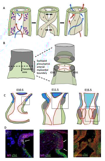 Initially, the main outflow cushions are completely contained within the SHF-derived myocardial part of the outflow tract []. However, at E10.5, SHF cells continue to add to the outflow tract and, although they initially remain undifferentiated, will later form SMC [,,]. This produces a histologically defined arterial–myocardial junction within the aortic root. Thus, the defining process in the formation and positioning of the aortic root may be the switch from differentiation of the SHF progenitors to cardiomyocytes proximal to the boundary, to SMC distal to the boundary (Figure 2B–D). This boundary between myocardial and non-myocardial fate is first apparent at E10.5 in mice, as a region we named the transition zone []. The transition zone does not have an anatomical identity but is identified as a region with cells that express the SHF-specific transcription factor Isl1, but at the same time co-express differentiated cardiomyocyte markers. Thus, cells in this region are transitioning from a progenitor to a cardiomyocyte fate. Above the transition zone, the SHF progenitors are in continuity with similar cells in the dorsal pericardial wall and will later downregulate Isl1 expression; the majority of these will go on to form the arterial SMC of the aorta and pulmonary trunk. However, not all the undifferentiated SHF cells within this boundary region become cardiomyocytes. At E10.5 (CS12 or around 28 dpc in human), two tongues of undifferentiated SHF cells can be seen to extend laterally into the otherwise myocardial outflow tract ([,]; Figure 2B). By E11.5, these non-myocardial extensions, surrounded laterally by cardiomyocytes, form the intercalated valve swellings (ICVS; sometimes erroneously called the intercalated cushions—see later) and are the primordia of the posterior (P) aortic (non-coronary) and anterior (A) pulmonary intercalated leaflets [,,]. The origin and remodelling of these ICVS to valve leaflets will be discussed in more detail later, but it is important to emphasise that their localisation within the wall, at the boundary between the myocardial and presumptive-arterial parts of the outflow tract, is unlikely to be coincidental to the remodelling of the main outflow cushions and may play an important role in defining the position of the arterial valve complex.
