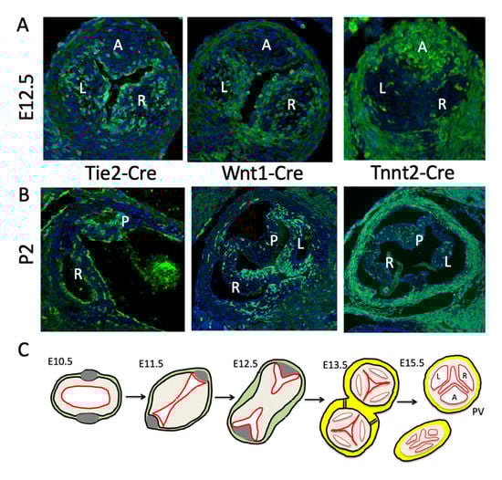 The intercalated leaflet valve swellings (ICVS), the precursors of the anterior/posterior leaflets, were first noted by Kramer [] and are seen clearly in cross sections through the outflow tract as lateral bulges within the outflow wall ([]; Figure 3 and Figure 4). Importantly, although they are overlaid by a thin layer of ECM, the bulk of these structures is completely distinct from the main endocardial cushions and, at their first appearance at E10.5, they do not contain ECM or form by EndMT. Nor do they contain significant numbers of NCC [,,,]. Lineage tracing studies have shown that the majority of the cells contained within the ICVS are derived from the SHF [,], with much smaller contributions from EndMT or NCC than are seen for the main endocardial cushions [,,,]. Although in some ways they have similarities to the lateral cushions that form the mural leaflets of the mitral and tricuspid valve [], they do not contain cells derived from the epicardium. Thus, they are distinct from other valve-forming structures within the developing heart. Although the ICVS are continuous with the outflow wall at E10.5–E11.5, they do not label with cardiomyocyte markers and are instead immuno-labelled with antibodies specific to Isl1. Whilst maintaining this progenitor-phenotype, they begin to express Sox9, a characteristic marker of cushion mesenchymal cells [], and thus differentiate to this fate without passing through the endocardial lineage during EndMT. The conclusion from this is that the ICVS are not endocardial cushions and that the cells within them differentiate directly from the SHF []. The confusion arises because although these ICVS arise from the outflow wall and their early formation is entirely distinct from the main outflow cushions [,], they rapidly take on the superficial appearance of endocardial cushions by generating large amounts of ECM and expressing typical cushion markers such as Sox9 []. Hence, by E12.5 they are almost indistinguishable from other cellularised valve primordia originating from endocardial cushions. Thus, after septation it is reasonable to called them “intercalated cushions”. However, subtle differences remain, for example, the ICVS are more cell-dense and express tropoelastin which the primordia derived from the main cushions do not (Eley, Chaudhry, Henderson; unpublished data). As well as having distinct origins, the ICVS also appear more distally than the right and left cushions, although later remodelling places all the leaflets within each root on their own orthogonal planes. Despite these later similarities, the undifferentiated SHF cells that form the ICVS can still be recognised as they are labelled by the “myocardial-specific” Tnnt2-Cre transgenic marker ([,,]; Figure 3A,B). Despite this they are not transdifferentiated cardiomyocytes (they never at any point express markers of differentiated cardiomyocytes) but at a very early stage activated the promoter used to produce the Tnnt2-Cre transgene. Whilst the Tnnt2-Cre line is therefore extremely useful for following the ICVS cells, it is important to recognise that if is used to drive Cre in the myocardium, there could also be direct effects on arterial valve development.