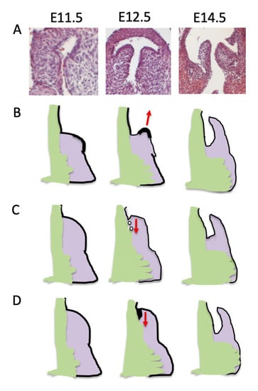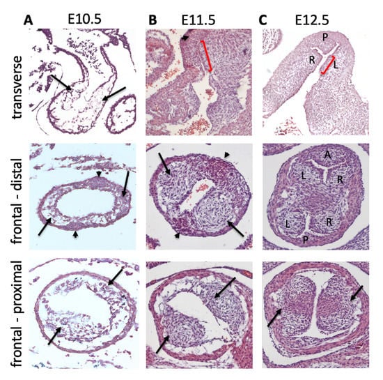 The period between E10.5 and E12.5 is crucial for the appearance of discrete arterial valve primordia that remodel at the distal end of the outflow cushions, distinct from the septal components that form from the proximal cushions (Figure 4). Although the factors that regulate this process remain unclear, the presence of the transitionary tissues at the myocardial–arterial boundary, or indeed the formation of the ICVS adjacent to the main cushions, may be significant. Thus, it is possible that unique factors within the boundary region influence the development of the adjacent cushion tissue to become valve-like, whilst the more distant proximal cushion acquires a septal phenotype, becoming muscularised by cardiomyocytes migrating from the enveloping myocardial outflow wall [,]. The resolution of this point will require further investigation.