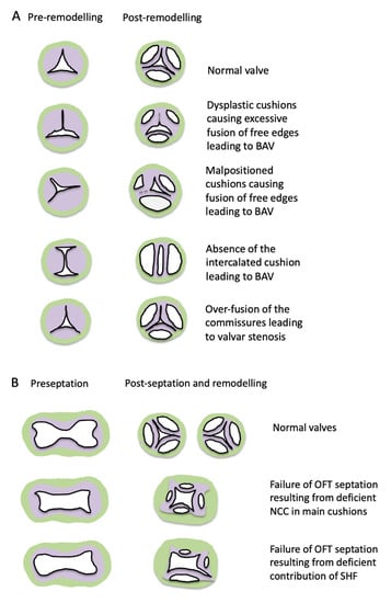 Numerous mechanisms to explain development of BAV have been proposed (Figure 6A) over the last century [,,,,,]. These include excessive cushion/leaflet fusion, failure to form the main cushions, abnormal outflow tract septation, and the absence of one of the leaflet primordia, primarily the ICVS that will form the non-coronary leaflet. Although many of these suggestions were made decades before developmental molecular genetics existed, these potential mechanisms remain and there is evidence for each of them as potential mechanisms for BAV in the literature today.