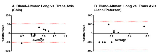 Bland-Altman tests to validate the agreement between measurements performed in the short versus the long axis of the heart. (A) transversal axis; (B) longitudinal axis
