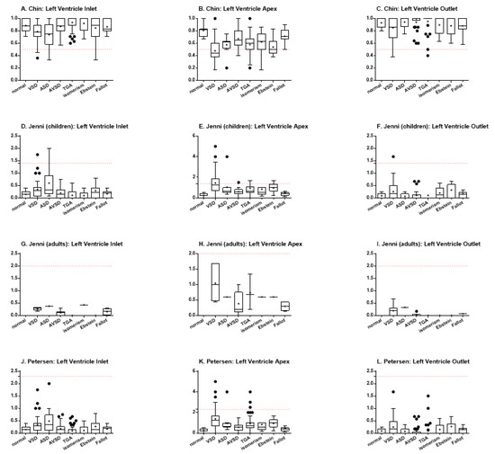 Indexes of ventricular trabeculation, as evaluated by Chin, Jenni, and Petersen methods, in the inlet, apex and outlet muscular walls of the left ventricle. The red dotted lines represent the threshold for LVNC for each criterium.(A) Chin, left ventricle inlet; (B) Chin, left ventricle apex; (C) Chin, left ventricle outlet; (D) Jenni, (children) left ventricle inlet; (E) Jenni, (children) left ventricle apex; (F) Jenni, (children) left ventricle outlet; (G) Jenni, (adults) left ventricle inlet; (H) Jenni, (adults) left ventricle apex; (I) Jenni, (adults) left ventricle outlet; (J) Petersen, left ventricle inlet; (K) Petersen, left ventricle apex; (L) Petersen, left ventricle outlet.