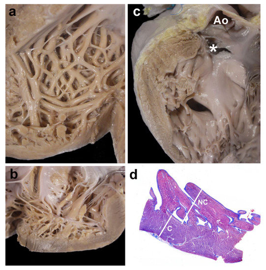 Gross and histological morphology. Four examples of cases showing focal non-compaction of the left ventricle. (a) and (b) Left ventricular wall of two cases with Ebstein’s anomaly of the tricuspid valve. The apical regions show a thick noncompacted layer when compared to the compacted myocardium. In (c), a case with a muscular trabecular ventricular septal defect shows a focal area of noncompaction at the left ventricular outlet free wall (* the membranous septum has been accidentally torn, but was originally intact); Ao—opened aorta. Panel (d) depicts the histological aspect of the apical region of a case with complete transposition of the great arteries, although histology was not used for measurements. The noncompacted layer (NC) is thicker than the compacted myocardium (C); Masson´s trichrome stain.