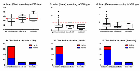 Indexes of left ventricular trabeculation according to VSD type (superior panels) and distribution of cases (inferior panels), as evaluated by Chin, Jenni, and Petersen methods, in. The red dotted lines represent the threshold for LVNC for each criterium. (A) index (hin) according to VSD type; (B) index (Jenni) accrding to VSD type; (C) index (Petersen) according to VSD type; (D) distribution of cases (Chin); (E) distribution of cases (Jenni); (F) distribution of cases (Petersen).