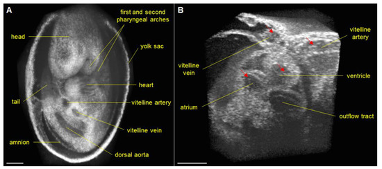 - Luo, W.; Marks, D.L.; Ralston, T.S.; Boppart, S.A. Three-dimensional optical coherence tomography of the embryonic murine cardiovascular system. J. Biomed. Opt. 2006, 11, 021014. [Google Scholar] [CrossRef]