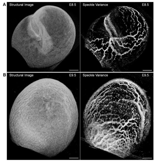 - Sudheendran, N.; Syed, S.H.; Dickinson, M.E.; Larina, I.V.; Larin, K.V. Speckle variance OCT imaging of the vasculature in live mammalian embryos. Laser Phys. Lett. 2011, 8, 247–252. [Google Scholar] [CrossRef]