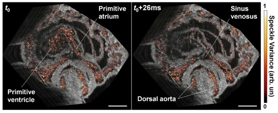 - Grishina, O.A.; Wang, S.; Larina, I.V. Speckle variance optical coherence tomography of blood flow in the beating mouse embryonic heart. J. Biophotonics 2017, 10, 735–743. [Google Scholar] [CrossRef]