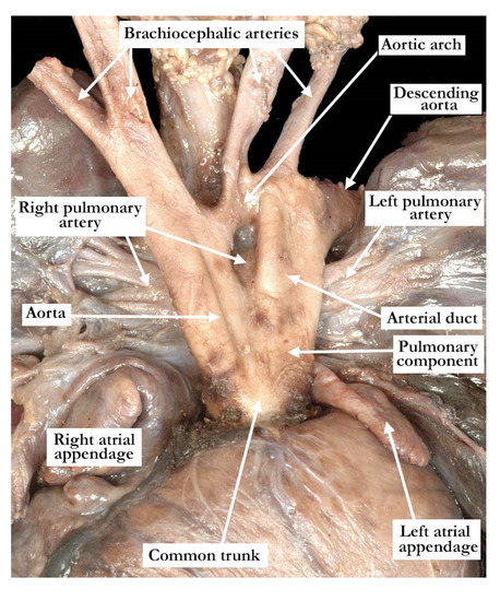 - Garg, P.; Mishra, A.; Shah, R.; Parmar, D.; Anderson, R.H. Neonatal repair of common arterial trunk with intact ventricular septum. World J. Ped. Cong. Heart Surg. 2015, 6, 93–97. [Google Scholar] [CrossRef] [PubMed]