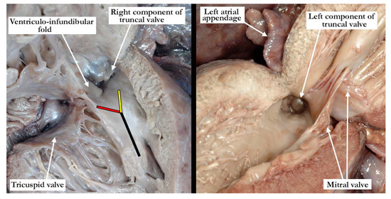 The left panel shows the right ventricle opened in clam-shell fashion with the tricuspid valve guarding the inlet and the stenotic valve at the outlet. Note the somewhat broad septal band (black line) that gives rise to the caudal (red line) and cephalic (yellow line) arms. The ventriculo-infundibular fold is hypoplastic, and inserts into the ‘Y’ of the septal band. The right panel shows the left ventricular outflow tract with the stenotic, dysplastic valve guarding the outlet. Note the hypertrophy within both the right and left ventricles.