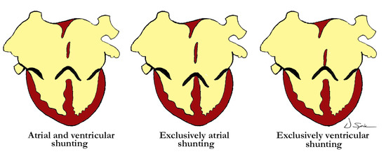 The illustration demonstrates the levels of shunting associated with the valvar arrangements in those hearts with atrioventricular septal defect. The left image shows both atrial and ventricular shunting, in the center there is exclusively atrial shunting, and to the right, exclusively ventricular shunting.