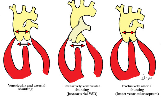 The illustration demonstrates the level of shunting in hearts with ventriculo-arterial septal defect with common ventriculo-arterial junction. The left image shows shunting at both ventricular and arterial levels, in the center there is exclusively ventricular shunting (juxtaarterial ventricular septal defect), and to the right, exclusively arterial shunting as demonstrated in our case with common arterial trunk and intact ventricular septum.