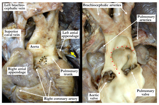 The left panel is an anterior superior view of the intrapericardial arterial trunks in a heart with an aortopulmonary window. The black dots demonstrate the separate aortic and pulmonary roots as the arterial trunks arise from the ventricular mass. (Yellow arrow—Left pulmonary artery) The right panel is from the same heart shown in the left panel. It demonstrates the large aortopulmonary window with the anterior aspect of the arterial trunks incised and folded forward. The borders of the window are marked with red dots. Note the entirely separate aortic and pulmonary valves.