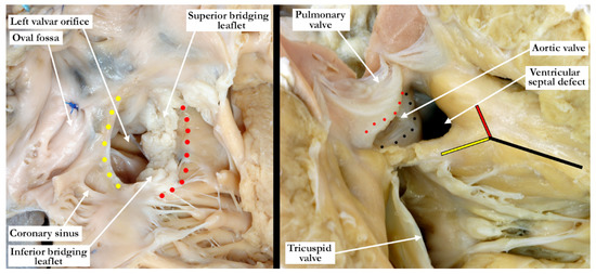 The left panel shows the opened right atrioventricular junction in this heart with a common atrioventricular junction. The superior and inferior bridging leaflets are adherent to one another and to the crest of the ventricular septum (red dots) effectively dividing the common junction into separate right and left orifices. Shunting can only take place at the atrial level. The yellow dots mark the leading edge of the atrial septum. The right panel shows the right ventricular outflow with a doubly committed, subarterial ventricular septal defect. The black line marks the body of the septal band, the red line, the cephalic arm and the yellow line the caudal arm which maintains its connection with the inner heart curvature, and thus will protect the conduction tissue. The pulmonary and aortic (black dots) valves are separate structures, and are in fibrous continuity (red dots) at the roof of the defect. Shunting can only occur at the ventricular level.