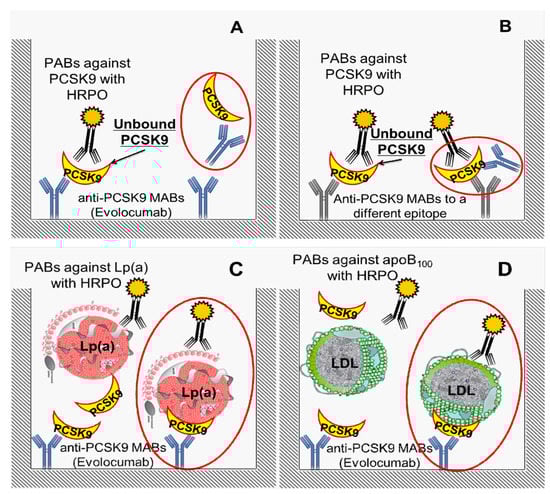 ELISA scheme for measuring: (A) PCSK9 not associated with MABs, (B) total pool PCSK9 unbound from and bound with MABs. Red circles highlight the complex of PCSK9 with MABs (Evolocumab); (C) PCSK9-Lp(a) and (D) PCSK9-apoB100 complexes. Red circles are demonstrated the detectable complex of coupled antibodies-antigen-second antibodies conjugated with horseradish peroxidase (HRPO). Abbreviations: PCSK9—proprotein convertase type 9 subtilisin/kexin, MABs—monoclonal antibodies, PABs—polyclonal antibodies, HRPO—horseradish peroxidase, LDL—low density lipoproteins.