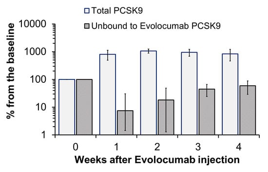 After a single injection of 140 mg of MABs Evolocumab, the concentration of PCSK9 circulating in plasma increased in all participants from 496 [369; 719] to 3944 [3132; 4629] ng/mL (median [25; 75%]), and almost the entire pool of circulating PCSK9 remained associated with MABs for 2–3 weeks (Figure 3 and Table 1). Starting from the third week after the injection, the concentration of PCSK9 slowly decreased but did not reach its initial level in any of the subjects.