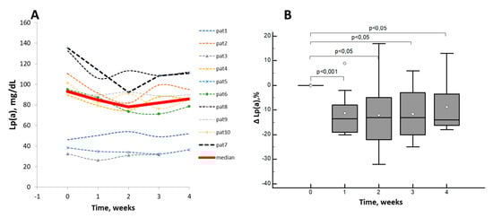 Lp(a) concentrations demonstrated multidirectional changes in different patients (Figure 4A) with the maximal decrease occurring on the second week after the drug administration. Despite the fact that the Lp(a) reduction was insignificant throughout the study, the median of changes in Lp(a) concentration varied from –13% [–24%; –2%] on the 2nd week to –14% [–16%; –3%] at the last visit (Figure 4B).