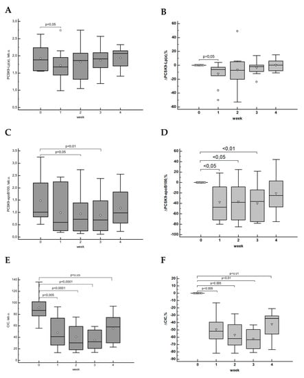 On the contrary, the decrease in the level of circulating complexes of PCSK9–apoB100 was significant at the 2nd week after the administration with the maximal reduction of –47% [–72%; –8%] on the 1st week, and gradual increase (–38% [–72%; –8%]) from the 2nd week (Figure 5C,D).