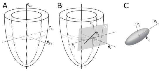 is the left ventricular long axis and and being orthogonal radial vectors, which are not used in the determination of myocyte orientations. (B) Subsequently, the local wall coordinate system is defined based on the orthonormal basis [], where is the local radial vector, i.e., the normal of the epicardial tangential plane A, is the local longitudinal vector, i.e., the normal of the local horizontal plane, and lastly is the local circumferential vector. (C) Finally, the diffusion tensor is defined by a sub-local coordinate system based on the orthonormal bases [], which are the three eigenvectors. Modified from [25].