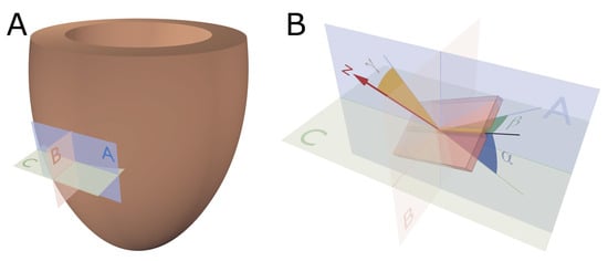 By using “standard” planes of reference based on “unique” reference points (Figure 2 and Figure 4), it becomes possible to quantify myocyte orientation by analysing the eigenvector corresponding to the myocyte chain’s long axis. In order to completely describe the orientation of a vector in a three-dimensional space, one needs to assess its orientation relative to two of the three reference planes discussed above [58]. It is Streeter and his colleagues who are usually credited with introducing the notion of the helical angle, which assesses myocyte orientation relative to the equatorial/horizontal plane of the ventricular cone [59,60]. However, this notion of change in myocyte angle relative to transmural position goes further back in time [61]. The idea that such angulation could be assessed relative to the horizontal plane was originally introduced by Feneis [62]. The notion was later endorsed by Hort [63] when the latter performed his extensive investigations of myocardial structure. Such helical angles are considered positive in the sub-endocardium, approximately zero in the mid-wall, and negative in the sub-epicardium.
