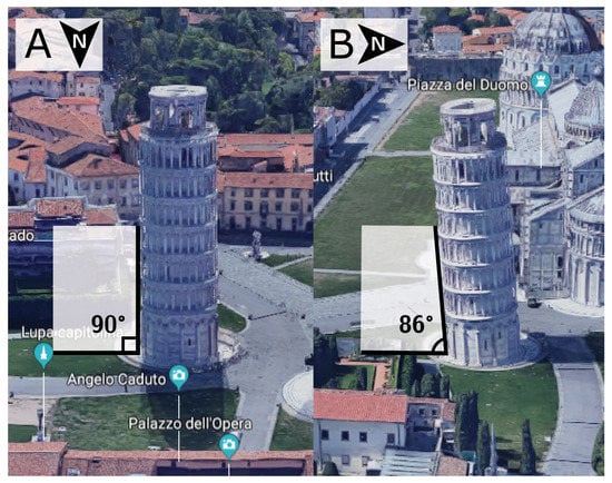 Projection artefact. The leaning tower of Pisa taken as an everyday example of projection artefact. The tower leans in a southward direction. Thus, when viewed from the north, the tower appears to be standing straight (A). When viewed from the east, however, the tower is obviously leaning (B). The straight appearance of the tower in panel A is an artefact brought upon by the projection of the tower into the camera lens. It would be inappropriate to use two-dimensional photography in an attempt to quantify the inclination of the tower. All projected angles in the setting of myocardial morphology are subject to projection artefact. ©2018 Google, Data SIO, NOAA, U.S. Navy, NGA, GEBCO, Landsat/Copernicus.
