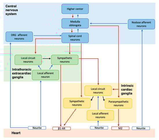 Model of the hierarchical control of the heart by the cardiac autonomic nervous system (CANS). The intrinsic cardiac nervous system (ICNS) contains efferent (parasympathetic and sympathetic) neurons, local afferent neurons and local circuit neurons. The intrathoracic extracardiac ganglia (stellate ganglia and middle cervical ganglia) contain sympathetic neurons, local afferent and local circuit neurons. The intrathoracic ganglia (intra- and extracardiac) work in close coordination as a nested loop, which is further tuned by the CNS (spinal cord, brainstem, hypothalamus, and forebrain) resulting in the regulation of cardiac function on a beat-to-beat basis. DRG: dorsal root ganglion; β1AR: beta 1 adrenergic receptor, M2: muscarinic acetylcholine receptor type 2. Neurite: local afferent neurites embedded in the cardiac walls. Figure adapted from Ardell & Armour J. Phys published by Wiley 2016 [2].