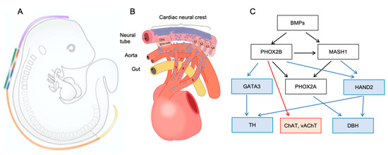 (A) Regionalization of the neural crest along the dorsal neural tube of the mouse embryo (E10.5): cranial (purple), vagal (green), trunk (orange), and sacral (yellow). Vagal neural crest cells (NCCs) are further subdivided into: cardiac (red) and enteric (blue) lineages. (B) Migration of cardiac NCCs through or lateral to the somites into the branchial arch arteries and further into the outflow tract. (C) Transcriptional network involved in the specification and differentiation of NCCs into sympathetic and parasympathetic neurons. White box: factors involved in both pathways; blue: factors involved in the differentiation of sympathetic neurons and red: of parasympathetic neurons. Abbreviations: BMPs- bone morphogenic proteins; ChAT- choline acetyltransferase; DBH- dopamine β-hydroxylase; GATA3- GATA binding protein 3; HAND2: heart and neural crest derivative expressed 2; MASH1- mammalian achaete-scute homologue; PHOX2 (A or B)- paired-like homeobox 2A or 2B; TH- tyrosine hydroxylase; vAChT- vesicular acetylcholine transporter. (A) reproduced with permission from Hutchins, E.J., et al. Dev. Biol published by Elsevier 2018 [29]; (B) reproduced with permission from Végh A.M.D., et al. JCDD by MDPI 2016 [10]; (C) adapted from Végh A.M.D., et al. JCDD by MDPI 2016 [10].