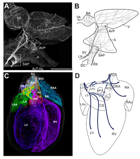 Intracardiac innervation of the zebrafish, rat and mouse hearts. (A) Whole mount immunostaining using antibodies directed against acetylated tubulin (AcT) and human neuronal protein (Hu) to label the ICNS of the zebrafish heart. (B) Schematic overview of the major elements of cardiac innervation. Boxed areas: sinoatrial plexus (SAP) and atrioventricular plexus (AVP). Abbreviations for A and B: A—atrium; AVP—atrioventricular plexus; BA—bulbus arteriosus; DC—ducts of Cuvier; LX and RX, left and right vagosympathetic trunks; SAP- sinoatrial plexus; SV—sinus venosus; V—ventricle; VA—ventral aorta (to the gills). (C) Posterior view of a 3D reconstructed male rat heart showing the context, extent, and distribution of the intrinsic cardiac neurons (yellow labelled), located on superior and posterior surfaces of the atria (D) Schematic overview of the intracardiac ganglia in the mouse heart, dorsal view. Dotted lines delineate the heart hilum, polygonal areas the main locations of the cardiac ganglia. Abbreviations for C and D: Ao- aorta; CS- coronary sinus veins; CV—caudal vein; DRA—dorsal right atrial; IAS—interatrial septum; LA—left atrium; LAA (or LAu)—left auricle; LCV—left cranial; LD—left dorsal; LPV—left pulmonary; LV—left ventricle; MPV—middle pulmonary veins: PA—pulmonary artery; PVs—pulmonary veins; RA—right atrium; RAA (or Rau) —right auricle; RCV—right cranial (superior caval) vein; RV—right ventricle; SVC—superior vena cava. Panel (A-B) reproduced with permission from Stoyek, M.R. et al., J. Comp. Neurol. Published by Wiley, 2015 [78]. (C) Reproduced with permission from Achanta, S. et al. iScience published by Elsevier, 2020 [81] (D) reproduced with permission from Rysevaite, K. et al., Heart Rhythm published by Elsevier, 2011 [74].