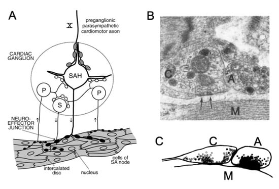 Neurocardiac transmission in the sinoatrial node (SAN). (A) Diagram illustrating the distinct cell types of the intracardiac ganglia and their putative roles: SAH (slow afterhyperpolarization) cells are the principal cells and the only ones receiving pre-ganglionic inputs. S (somatic) cells and some SAH cells can receive inputs from P (pacemaker) cells. P cells are putative sensory neurons. (B) Electron micrograph of the neurocardiac junction at the level of the sinus venosus of the toad. Cholinergic (C) and adrenergic (A) varicosities in contact with a cardiomyocyte (M). No membrane specializations are visible except for an electron dense area as indicated by the arrows. (C) Reconstruction of the neurocardiac junction depicted in (B). Cholinergic vesicles are present in the prejunctional membrane facing the cardiomyocyte and the adrenergic varicosity, respectively whilst adrenergic vesicles are mainly present in close opposition to the cardiomyocyte. The black area between the neuronal varicosity and the cardiomyocyte represents the cleft. Panel (A) reproduced with permission from Jänig, W., J. Physiol. published by Wiley, 2011 [91]. Panel (B,C) reproduced with permission from Klemm, M. et al., J. Auton. Nerv. Syst. published by Elsevier, 1992 [92].