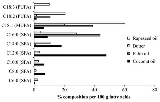 As Figure 1 demonstrates, though butter and coconut oil are both classified as saturated fat, they have very different fatty acid profiles. Coconut oil is the highest natural source of lauric acid. Lauric acid and its derivative monolaurin constitute around 50% of coconut fat-derived lipids [36]. The shorter chain length influences absorption such that medium-chain fatty acids are mostly absorbed intact and transferred via the portal vein directly to the liver on a mixed diet. Medium-chain fatty acids (MCFA) are partly metabolized in the mitochondria of the liver to produce ketone bodies, including 3-β-hydroxybutyrate, acetoacetic acid, and acetone, which are then transported to the organs of the body such as the brain, which can use ketones for energy production [30]. Due to the high concentration of lauric, capric, and caprylic acids, it has been suggested that coconut oil has unique properties different from other foods high in SFAs [37]. It should be noted that the majority of research on MCFAs has been focused on C8:0 and C10:0 fatty acids, although C6:0 to C12:0 are also considered MCFAs, based on their similar properties [33,38]. Because of their absorption characteristics, MCTs have been used since the 1960s in clinical formulas for adult and infant patients who have issues with the absorption of longer chain fats. Because C12:0 diffuses into the mitochondrial membrane without requiring the carrier carnitine, unlike longer chain fatty acids, it has historically been used for sports nutrition products when quicker absorption and utilization are desirable [39]. Lauric acid can be classified as either a long-chain or MCFA, depending on digestion and absorption and what else is being consumed in the diet. For example, it has been reported that when subjects consume a diet containing different fats, MCFAs tend to be channeled towards the portal vein. However, when the diet is mainly MCFA, some of these may also be incorporated into chylomicrons, suggesting the body adjusts based on the fat content of the diet [40]. This may explain some of the conflicting results that are reported in the literature [33]. Because of these differences in properties and its health benefits, lauric acid should not be considered the same as other longer-chain saturated fatty acids, such as palmitic acid (C16:0) and stearic acid (C18:0), which are much more prominent in butter and animal fats. For example, it has been reported that coconut oil consumption leads to a more favorable lipid profile compared to consumption of butter [38].