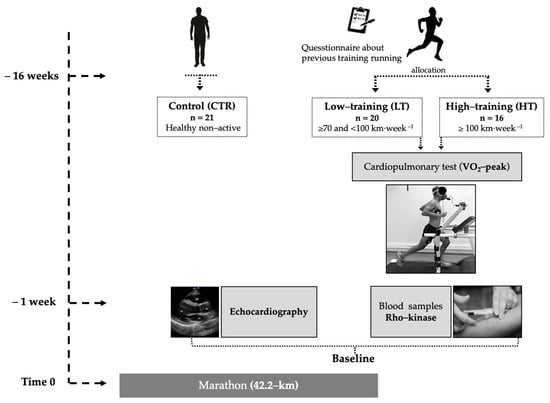 The study was cross-sectional with single blinding in researchers responsible for analyzing the serum samples and performing the echocardiographic reports and statistical analysis; they did not know to which group each subject belonged. After completing an ad hoc questionnaire with open questions concerning sports history, previous injuries, and time availability to training, LDRs were allocated to groups according to feasible weakly exercise volume during the training period before the marathon race. Running 100 km per week as a maximum exercise volume was adopted as a limit to separate the groups; this criterium has been used previously by our research group []. Thus, some LDRs were allocated to a high-training group (HT ≥ 100 km·week−1, n = 16) and a low-training group (LT ≥ 70 and <100 km·week−1, n = 20). Figure 1 shows the study design and assessments performed.