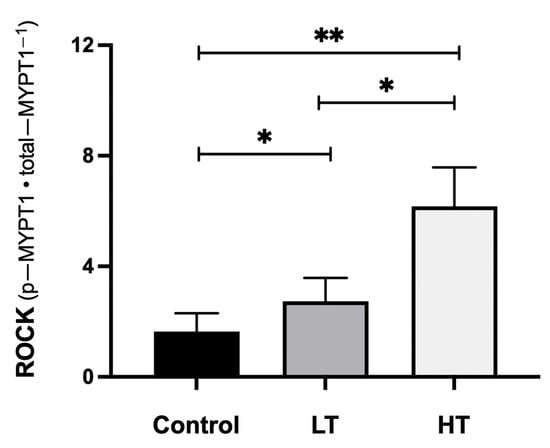 ROCK activity levels by group. Abbreviations: ROCK: Rho kinase activity expressed as p-MYPT1/t-MYPT1 ratio; LT: low training (≥70 and <100 km·week−1); HT: high training (≥100 km·week−1). * p < 0.01. ** p < 0.001.