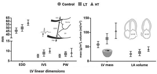 Previous reports revealed that athletes who participate in competitive endurance sports show a heart remodelling process similar to our findings. Athletes showed an increased LA volume and LV mass with normal systolic and diastolic function; these structural changes were more pronounced in those with a more intensive training protocol [,,]. A meta-analysis in athletes with high training regimes showed that acute and prolonged exercise was associated with larger LV volumes and a relative lower LV ejection fraction post-intensive exercise []. In this study, the HT group showed a greater left cardiac remodelling process, which potentially gives athletes better performance in highly demanding races []; however, these changes could be related to a theoretically excessive and deleterious remodelling process [], which is in keeping with other reports showing inflammatory and cell remodelling biomarker elevation in athletes, whose complete significance is not fully clarified [,].
