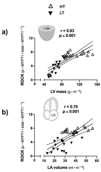 Correlation between ROCK activity and heart remodeling parameters. (a) ROCK activity (expressed as p−MYPT1/t−MYPT1 ratio) and LV mass index; (b) ROCK activity and LA volume index. Abbreviations: LV: left ventricle; LA: left atrium.