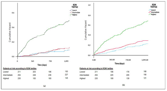 Continuous variables were reported as the median and interquartile range (IQR). Among groups, the comparison was made using a non-parametric test (Kruskal–Wallis). Categorical variables were reported as counts and percentages. Among groups, a comparison was made using Pearson Chi-square or Fisher’s exact test when appropriate. Plots of Kaplan–Meier curves for time to all-cause death and composite endpoint according to RDW tertiles were performed; groups were compared using the log-rank test. Multivariable proportional hazard models were used to estimate the association between RDW tertiles, all-cause death, and the composite endpoint, the lowest tertile was used as a comparator group. We created three multivariable models: Model 1 was adjusted for age and reduced LVEF, Model 2 was adjusted for the same variables of Model 1 plus reduced GFR calculated with CKD-EPI (<60 mL/min) and Model 3 was adjusted for the same variables of Model 2 plus hemoglobin levels and red blood cells count (RBC). Results were expressed as Hazard Ratio (HR, 95% confidence interval CI) and the corresponding p-value. Receiver operator curves to analyze RDW predictive ability for all-cause death and composite endpoint were analyzed. For all the analyses, the level of statistical significance was set at a probability value of p < 0.05. Statistical analyses were performed using SPSS version 26 software.