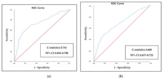 ROC curves showed that RDW had an acceptable predictive ability for all-cause death (C-statistics: 0.741, 95% CI 0.694–0.788) and a modest predictive ability for the prediction of the composite endpoint (C-statistics: 0.680, 95% CI 0.637–0.722) (Figure 2a,b).
