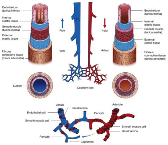 The anatomy of large and small vessel differs in structure and function (Figure 1) [,]. Large vessels (i.e., arteries and veins) are composed of three layers: an inner layer composed of endothelium; middle layer formed by smooth muscle cells, elastic tissue, and collagen fibers; and outer layer composed of elastic tissue and collagen fibers []. The percentage of elastic tissue in the arteries in considerably higher than veins because arteries transport blood at higher pressures []. Small vessels (i.e., arterioles, venules, and capillaries) are narrower and thinner than large vessels and participate in blood perfusion. Capillaries are the smallest vessels and are one-cell thick to allow mass exchange and fluid permeability. The cellular structure of large and small vessels is also distinctive. Arteries, veins and arterioles are composed of endothelial cells (ECs), smooth muscle cells (SMCs), and pericytes []. Venules are made of ECs, pericytes, and SMCs that differ in vessel thickness that than arterioles [,]. Capillaries are composed of a single layer of ECs and pericytes [].