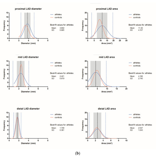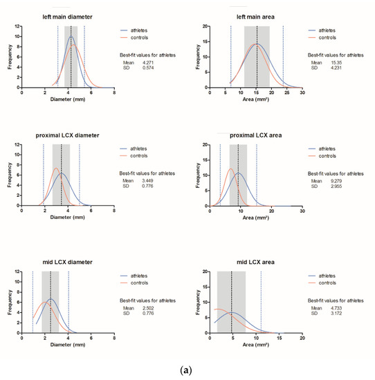 (1) Background: The athlete’s heart may develop permanent vessel enlargement. The purpose of our study was to define normal values for coronary artery dimensions of endurance athletes by coronary computed tomography angiography (CTA). (2) Methods: Ninety-eight individuals (56.2 ± 11 years) were included into this retrospective matched case-controlled-study. Endurance athletes had regular training volumes of ≥1 h per unit, ≥3–7 times per week (either cycling, running or mountain-endurance). Athletes were matched for age and gender with sedentary controls using propensity score. Quantitative CTA analysis included coronary vessel dimensions (two diameters and area) of the LM, LAD, CX and RCA for all AHA-16-segments. (3) Results: Proximal LAD area and diameter (p = 0.019); proximal/mid CX (diameter and area; p = 0.026 and p = 0.018/p = 0.008 and p = 0.009); mid RCA diameter and area; and proximal RCA diameter were significantly larger in endurance athletes (p < 0.05). The left main area (p = 0.708) and diameter (p = 0.809) as well as the mid LAD and distal segments were not different. We present the histograms and data for normal values ±1 and ± 2 SD. (4) Conclusions: Endurance athletes have larger proximal LAD, proximal/mid CX and RCA vessel dimensions, while LM and distal segments are similar. Hence, dilated coronary arteries in endurance athletes (“Athlete’s arteries”) have to be distinguished from diffuse ectatic segments developing during Kawasaki disease or multisystemic inflammation syndrome after COVID-19.