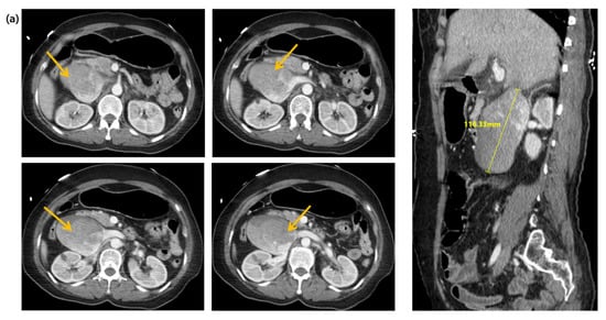 A 58-year-old woman with an unremarkable medical history visited the emergency department (ED) for worsening dizziness and dyspnea, noted one day before. The patient was alert and had normal peripheral oxygen saturation (SpO2) when the paramedics arrived. However, her mental state and oxygen saturation level declined during transport to the hospital. She had an SpO2 of 83% despite receiving 100% oxygen supplementation through a face mask with a reserve bag. The blood pressure was not measured due to a weak pulse. The patient was drowsy upon arrival at the ED. Cardiac arrest with pulseless electrical activity occurred after five minutes, and spontaneous circulation was restored after two minutes of cardiopulmonary resuscitation. A computed tomography (CT) of the brain, chest, and abdomen–pelvis (AP) was taken two hours after arrival. The AP-CT revealed an 8 × 11 cm saccular aneurysm involving the left and right renal veins at the infrahepatic level of the IVC (Figure 1). The chest CT revealed massive pulmonary embolisms involving both distal main pulmonary arteries (Figure 2a). A hyperdense middle cerebral artery (MCA) sign indicating thrombosis of the M1 MCA segment and widely decreased gray matter densities in the left hemisphere and right frontal lobe were detected on the brain CT (Figure 2b) [5]. A tissue plasminogen activator was administered two and a half hours after arrival, and the patient was admitted to the intensive care unit. The patient developed a seizure; therefore, a follow-up brain CT was performed after six hours. This showed a broad infarcted area involving most of the cerebrum, except for the thalamus and right occipital lobe. An electroencephalogram taken two days after admission suggested the possibility of brain death, and a bedside transthoracic echocardiography performed on the fourth day of hospitalization showed an enlarged RV with reduced RV systolic function. The patient’s family decided against a further evaluation or advanced treatment; therefore, the patient was conservatively managed at this point. Normal blood pressure was not achieved despite administering high-dose inotropic agents during the seventh day of hospitalization, and the patient died on the eleventh day of hospitalization.