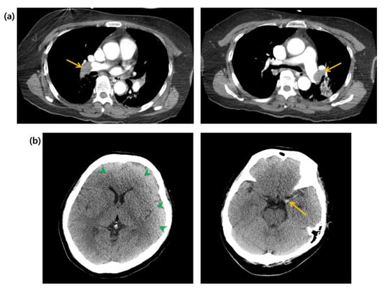 (a) Computed tomography of the chest. Arrows indicate massive pulmonary embolisms. (b) Computed tomography of the brain. Green arrowheads indicate widely decreased gray matter density. Yellow arrow indicates hyperdense middle cerebral artery sign.