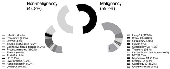 PE commonly occurs in patients with malignancy and has been reported in up to 21% of patients, and lung cancer is the most common primary malignancy associated with PE, followed by breast cancer and lymphoma [,]. Malignancy is a common cause of PE and is a marker of poor prognosis. PE associated with malignancy may lead to cardiac tamponade, which is a life-threatening condition. Pericardial fluid drainage is typically performed in symptomatic patients and may play a role in its diagnosis and staging. Surgical drainage can be used for its management; however, it is associated with a high rate of morbidity []. In cancer patients with a poor prognosis, surgery may not be suitable as it involves high risk. Therefore, a less invasive strategy of echo-guided percutaneous needle pericardiocentesis presents the potential of the safe and effective management of these patients with cancer. However, the long-term outcomes of pericardiocentesis are less defined in the East Asian population.