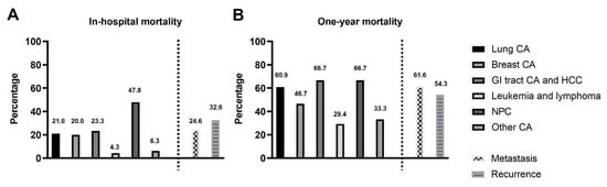 (A): The incidence of in-hospital mortality in different cancers: The patients with nasopharyngeal and oropharyngeal cancer had the highest in-hospital mortality rate. (B). The incidence of 1-year all-cause mortality in different cancers: The patients with gastrointestinal tract cancer and nasopharyngeal and oropharyngeal cancer had the highest 1-year mortality rate. Abbreviations: CA: cancer; GI: gastrointestinal; HCC: hepatological cancer; NPC: nasopharyngeal cancer.