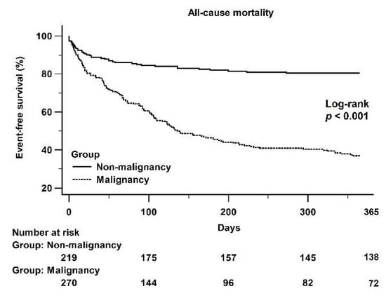 A Kaplan–Meier curve of the 1-year all-cause mortality between the non-malignancy and malignancy groups: There was a significant difference between the non-malignancy and malignancy groups (log-rank p < 0.001).