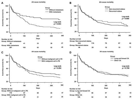 In the malignancy group, there was a significant difference in 1-year all-cause mortality between the subgroups, both with and without metastasis (log-rank p = 0.003) (Figure 4A). A significant difference in the 1-year all-cause mortality between the recurrent and non-recurrent (Figure 4B) was not observed, and with or without the presence of malignant cells in PE (Figure 4C). Figure 4D shows that there was not a significant difference in the 1-year all-cause mortality between lung and breast cancer and other cancers.