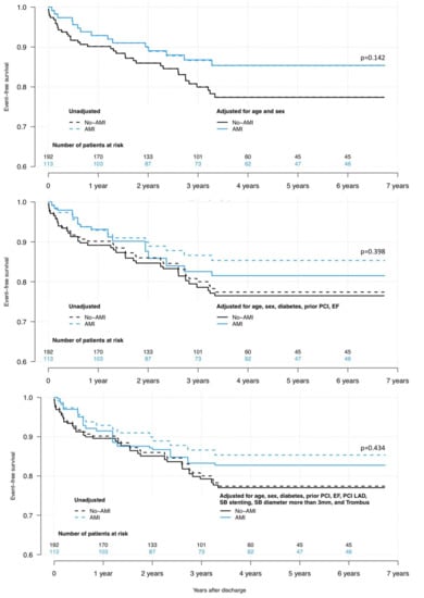 Three models of Kaplan-Meier analysis between AMI and non-AMI groups for MACE-TLF were performed: 1, adjudicated for age and sex; 2, adjudicated for age, sex, diabetes, prior PCI and EF; 3, adjudicated with previous variables and PCI LAD, SB stenting, SB > 3 mm and thrombus. None of the analysis showed statistically significant difference in event-free survival between AMI and non-AMI groups (Figure 1).